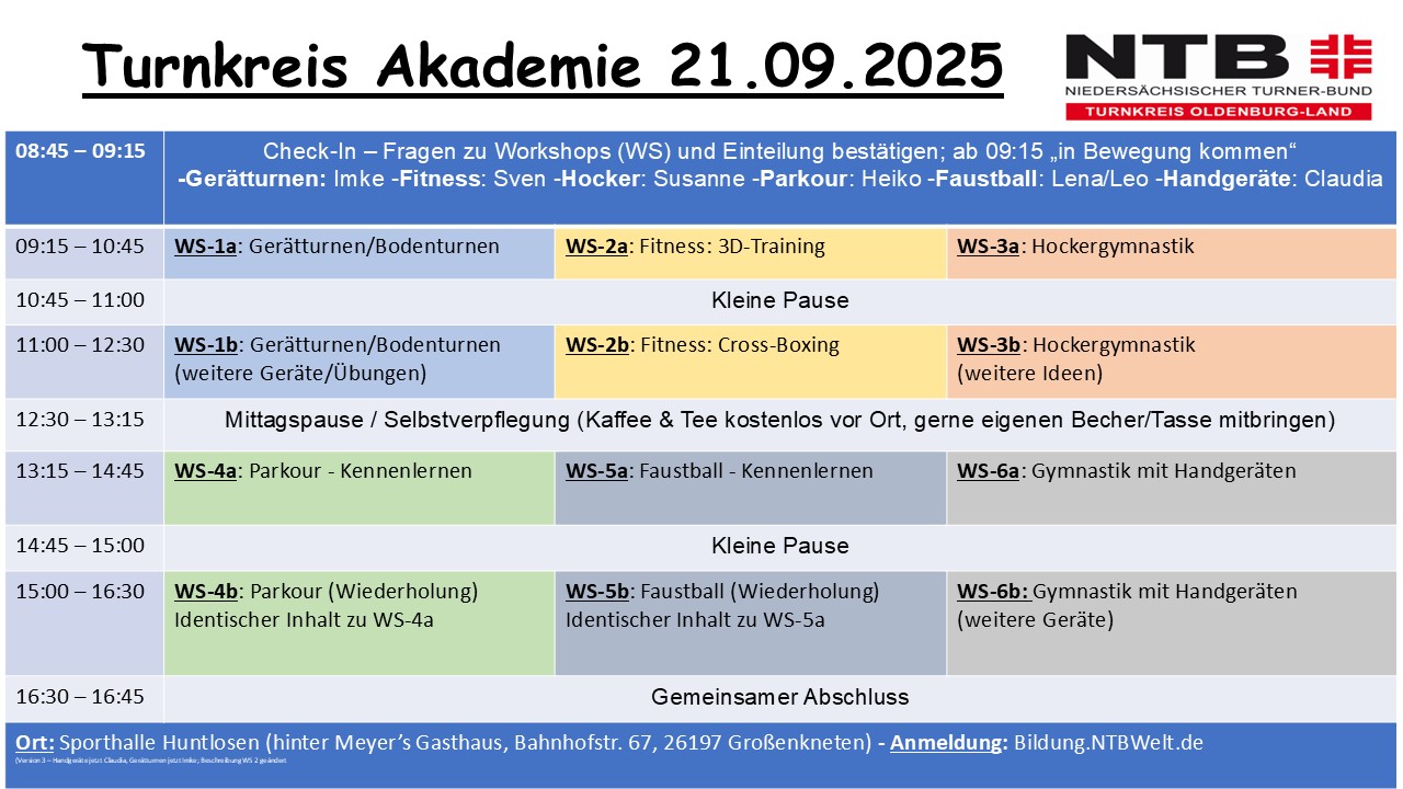 Du kannst für die Turnkreis Akademie aus verschiedenen Workshops wählen. Wir haben 4 Zeitscheiben für die Workshops vorgesehen. Wir starten um 08:45 mit dem Check-In, Vorstellungsrunde, Austausch über die Erwartungen an den Tag, etc.